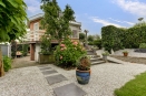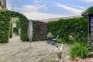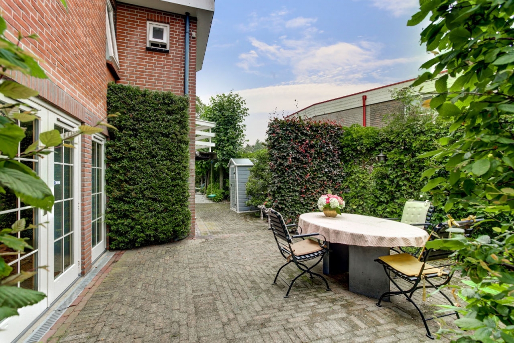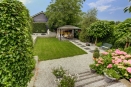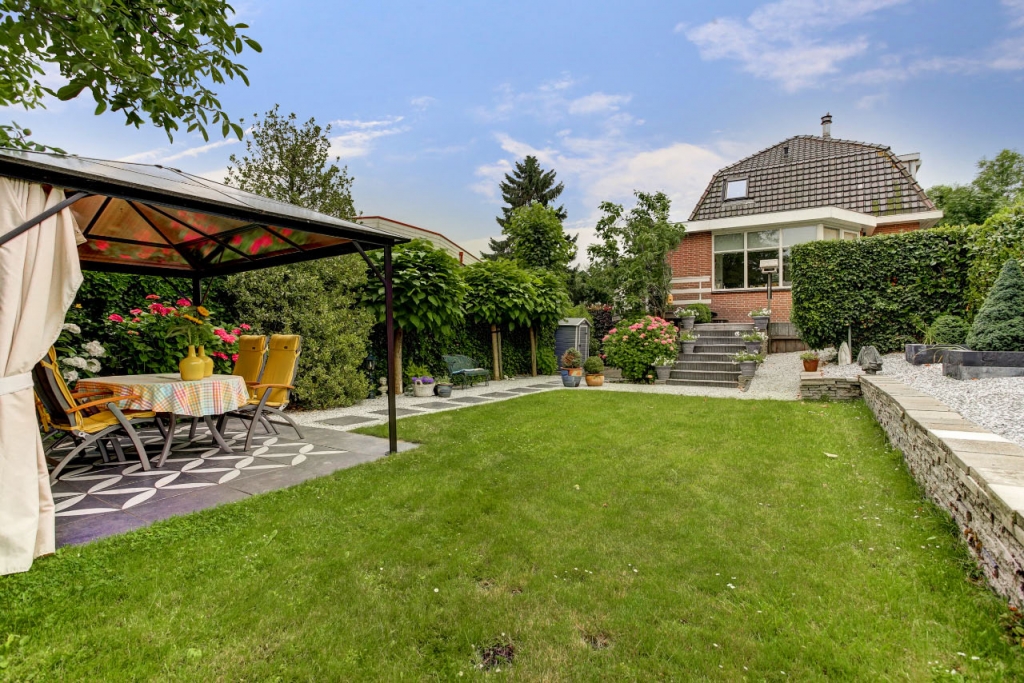 . De fraaie tuin is voorzien van een sierhekwerk, diverse terrassen, een gazon, diverse borders, hagen, struiken, bomen en een tuinhuis.