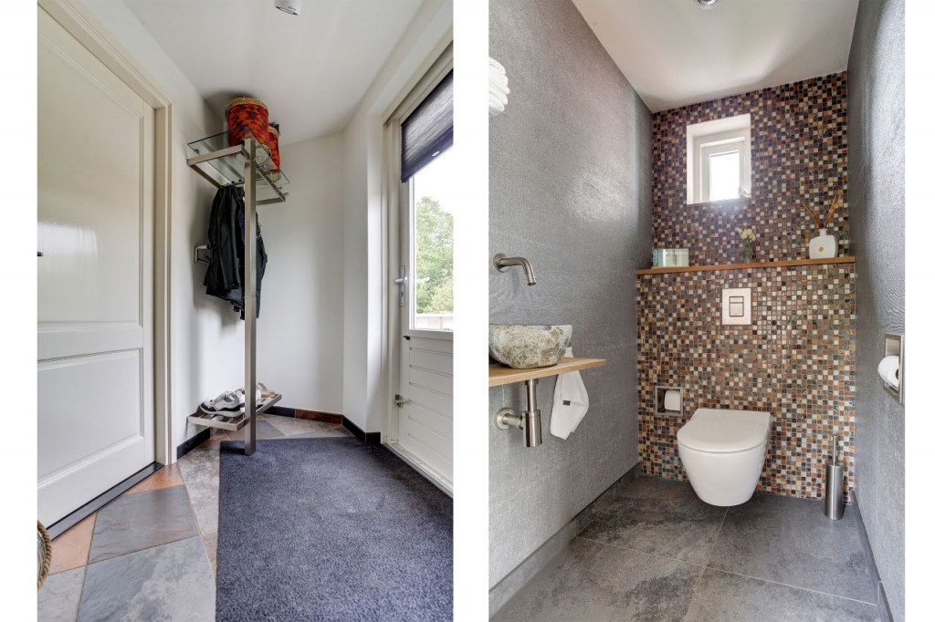 Hal/entree met meterkast, trapopgang, trapkast; woonkamer met balkenplafond en haard; royale woonkeuken met serre; achterportaal; toiletruimte met zwevend toilet en sfeervol fonteintje.