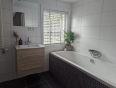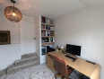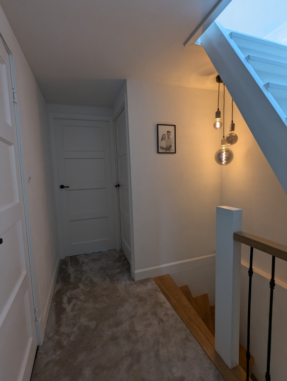 Overloop met trapopgang naar 2e verdieping; 3 slaapkamers, waarvan 1 met dakkapel en 1 met schuifpui; badkamer met ligbad, douchecabine, wastafelmeubel, 2e zwevend toilet en handdoekradiator.