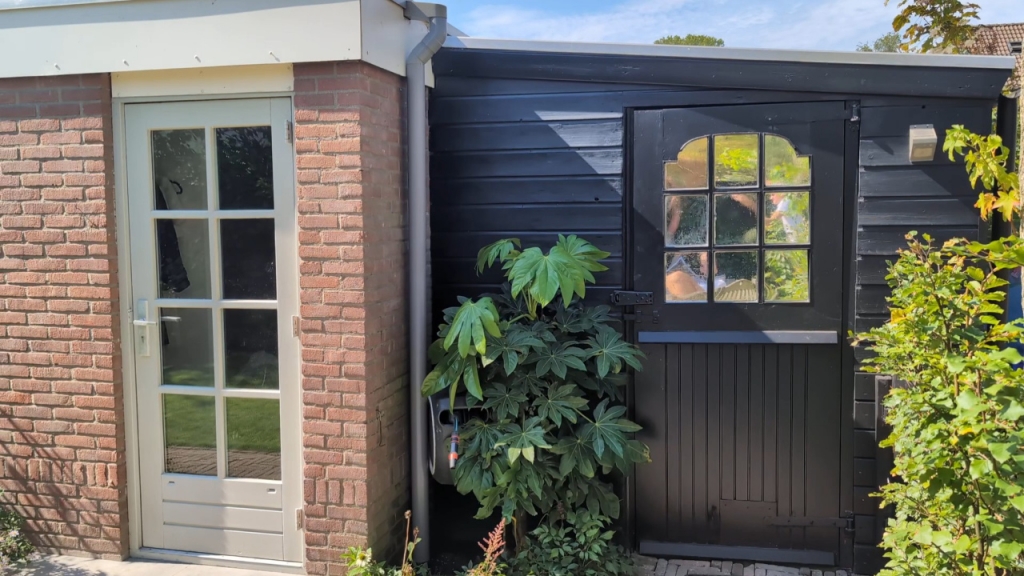 . De aangebouwde houten gepotdekselde berging achter de woning, groot ca. 10 m², is voorzien van een betonvloer en elektra (voorbereiding voor verwarming is aanwezig).