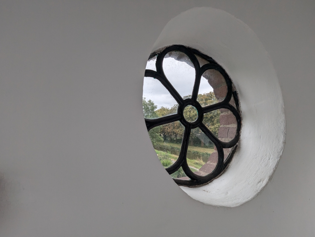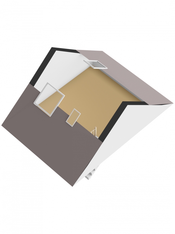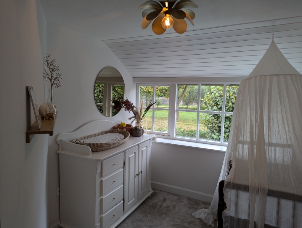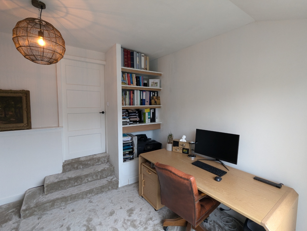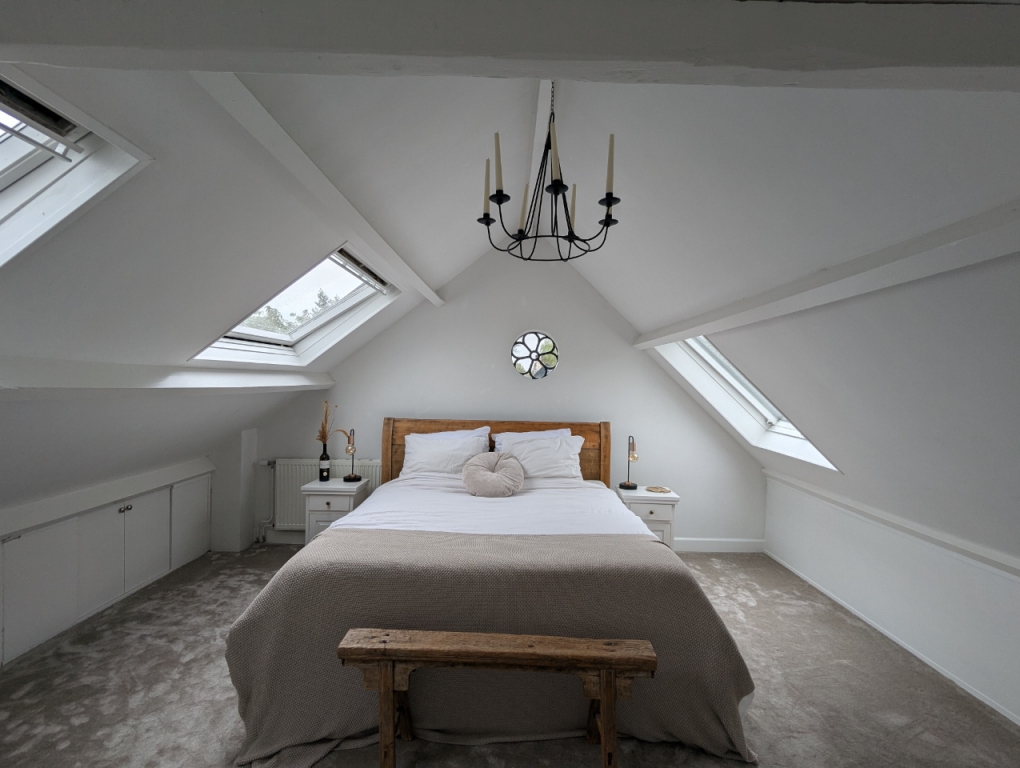 Open ruimte/slaapkamer met 3 dakramen, een gietijzeren “stalraam” en bergingen achter de knieschotten.