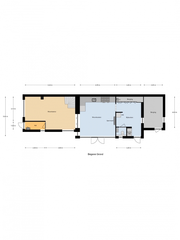 Entree met meterkast; woonkamer met kachelaansluiting, trapopgang en authentieke schuifdeurenverbinding naar woonkeuken; woonkeuken met gashaard, balkenplafond en openslaande tuindeuren; bijkeuken met wasmachine-aansluiting, kastenwand, garderobenis en tuindeur; toiletruimte met zwevend toilet, fraai fonteintje en “verborgen” kast achter het tegelwerk.