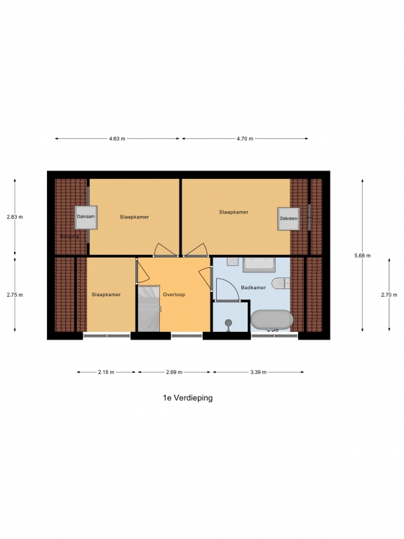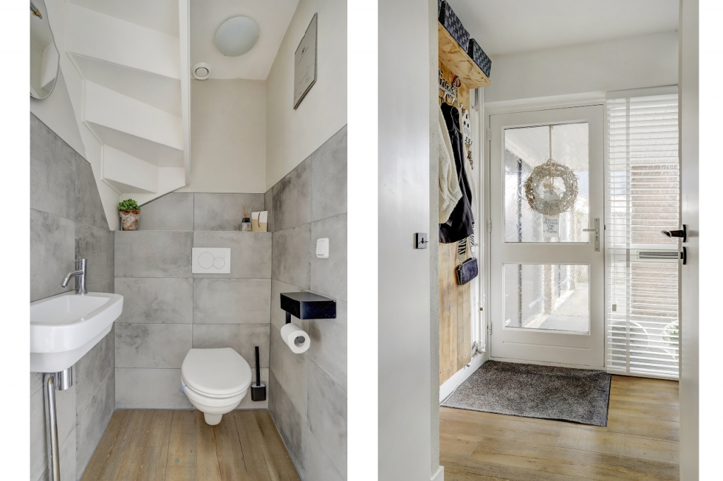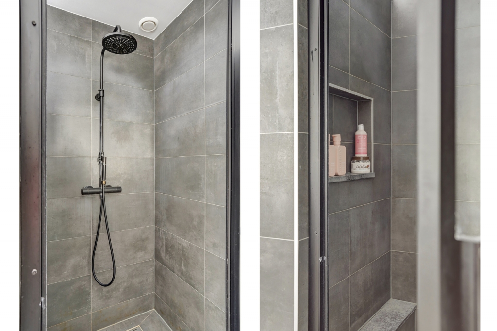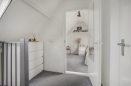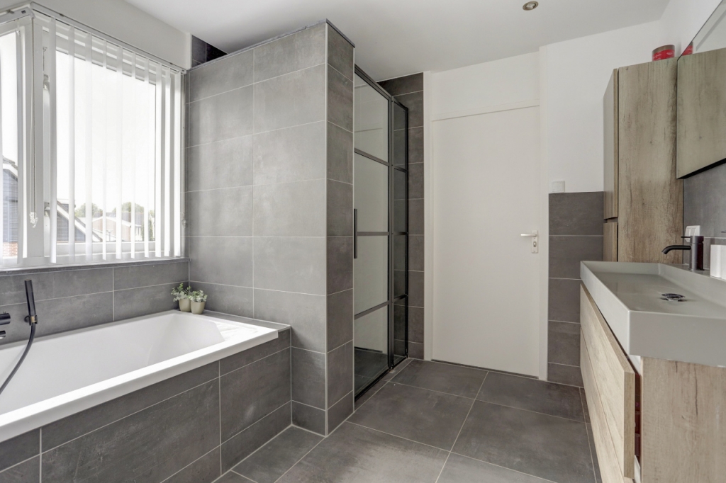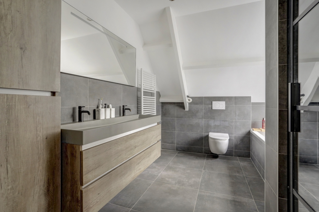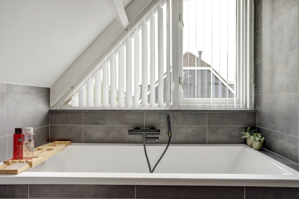 Overloop; 3 slaapkamers, waarvan 1 met dakraam en 1 met dakraam en berging; luxe badkamer (2019) met ligbad, inloopdouche, dubbele wastafel en 2e toilet.
