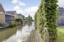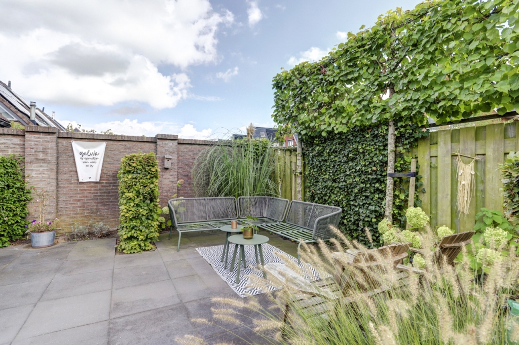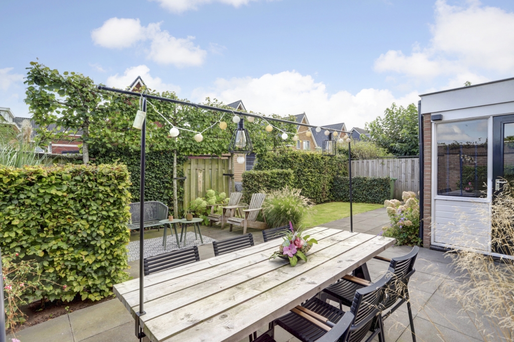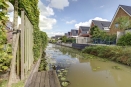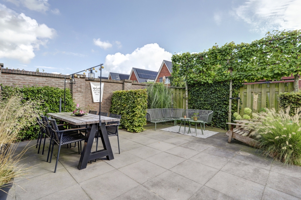 . De sfeervol aangelegde achtertuin is voorzien van meerdere terrassen, moderne tuintegels, een vlonder aan het water, een gazon, bloemborders, diverse hagen, leibomen, lichtspotjes en een schutting en stenen muur als erfafscheiding.
