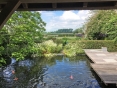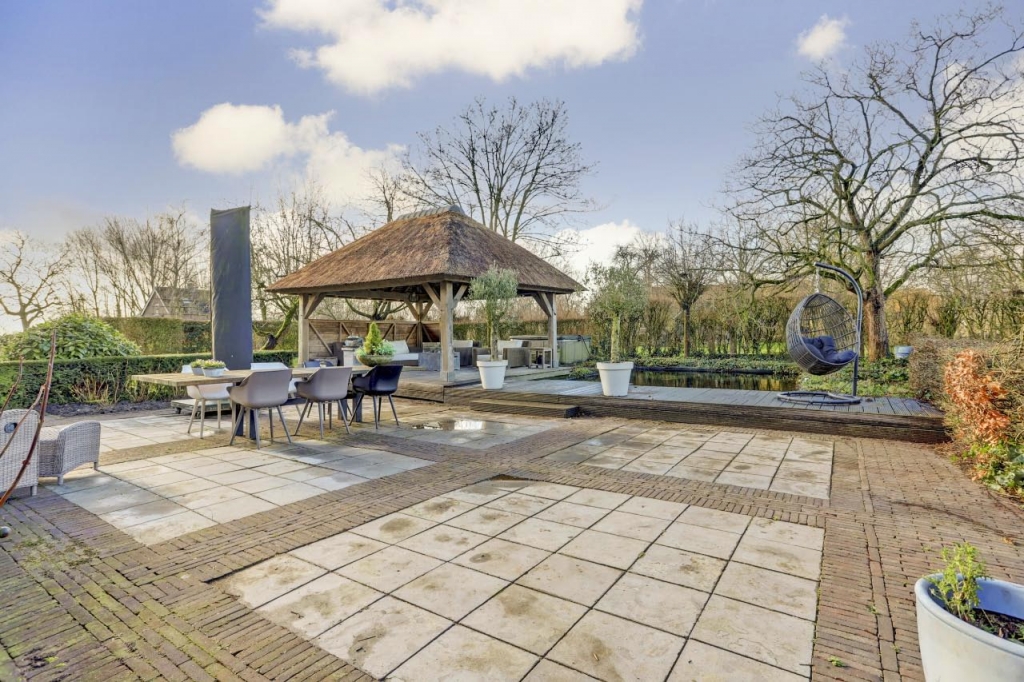 . De sfeervolle tuin beschikt over diverse terrassen, een gazon, bloemborders, hagen, diverse fruit- en sierbomen, leilinden, een sfeervol prieel, een vijver (met kooikarpers), een buitendouche, hardhouten beschoeïng (2022) en hardhouten vlonders.