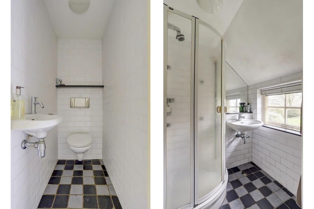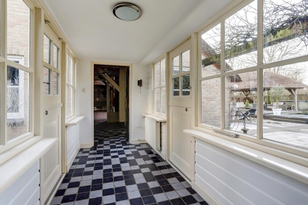 Entree voorhuis; woonkamer met authentieke schouw en houtkachel, twee voormalige bedsteden en dakraam; royale woonkeuken/living met vide, inbouwkasten, open trapopgang, twee dakramen, openslaande tuindeuren en houtkachel (HR) met ventilatoren; portaal; toiletruimte met zwevend toilet en fonteintje; badkamer met hoekdouchecabine en wastafel; slaapkamer met inbouwkast; ouderslaapkamer met 3 inbouwkasten en privé badkamer; badkamer met ligbad, inloopdouche met stort- en handdouche, dubbele wastafel met Belgisch hardsteen blad, 2e zwevend toilet en handdoekradiator; tussenlid met 2 tuindeuren/verbinding naar stal; bijkeuken met wasmachine-aansluiting, washoek en inbouwkast met c.v. ketel; paardenstal met vier boxen, waarvan 1 deelbaar. De stal is voorzien van 2 x 2 openslaande deuren, 2 loopdeuren en is gedeeltelijk bezolderd. Op de stalzolder (gedeeltelijk) bevindt zich een boiler (200 liter).