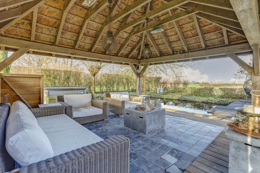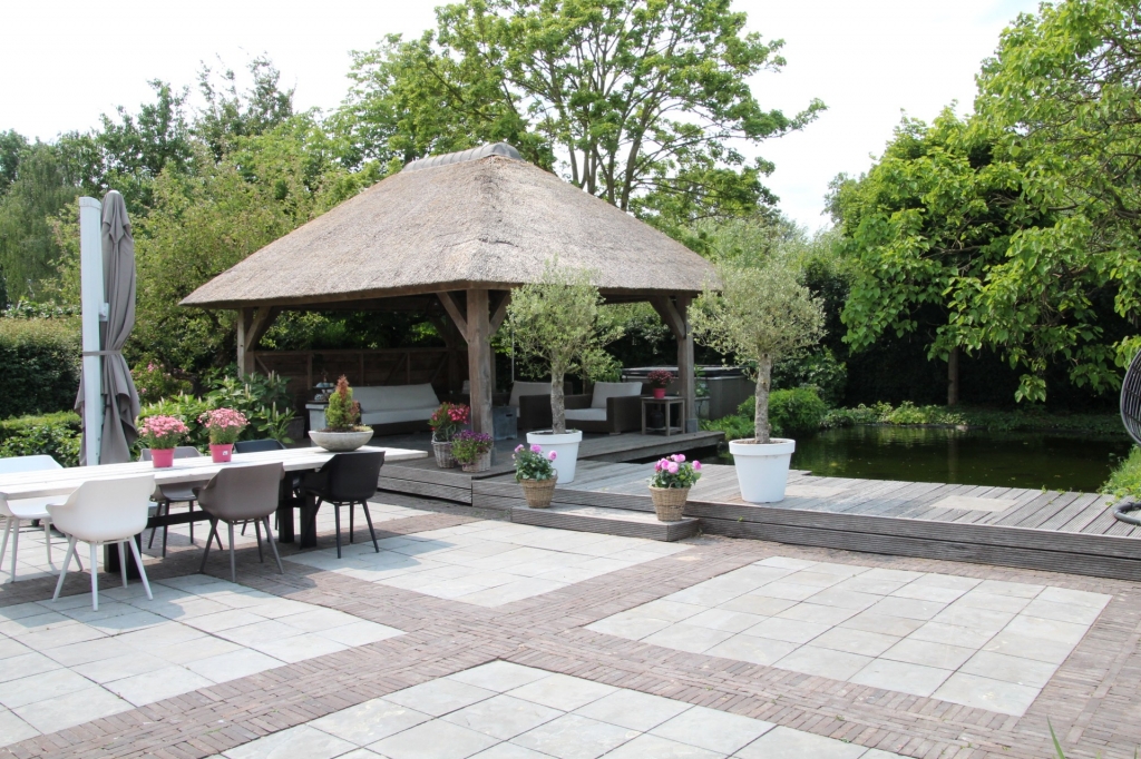 . Prieel, gebouwd in 2011, is groot ca.42 m² en voorzien van een rieten kap, electra, hardhouten vlonders en tuintegels.