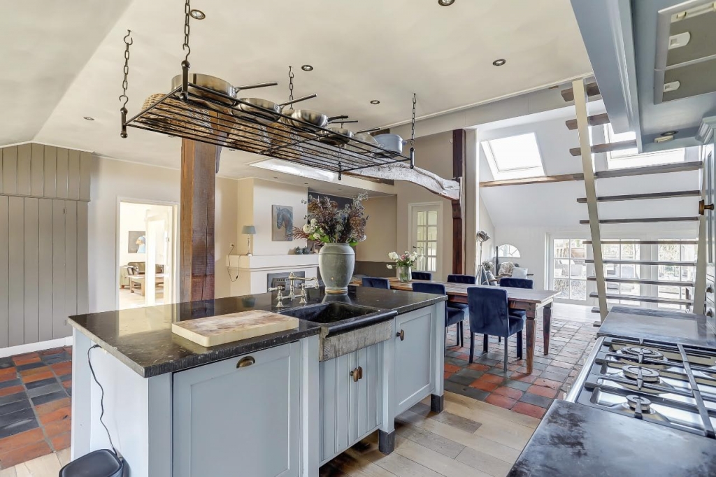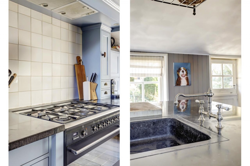 . De op maat gemaakte Eco keuken met watereiland is voorzien van een hardstenen werkblad met een gezaagde rand en beschikt over de volgende inbouwapparatuur: afzuigkap, Smeg gasfornuis (2023) met 6-pits kookplaat en combi heteluchtoven, koelkast en vaatwasmachine.