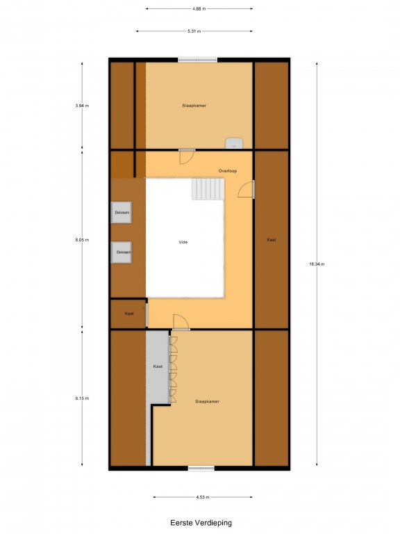Dubbel gerookte eikenvloerdelen: woonkamer, woonkeuken (gedeeltelijk), slaapkamers begane grond, vide