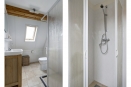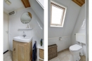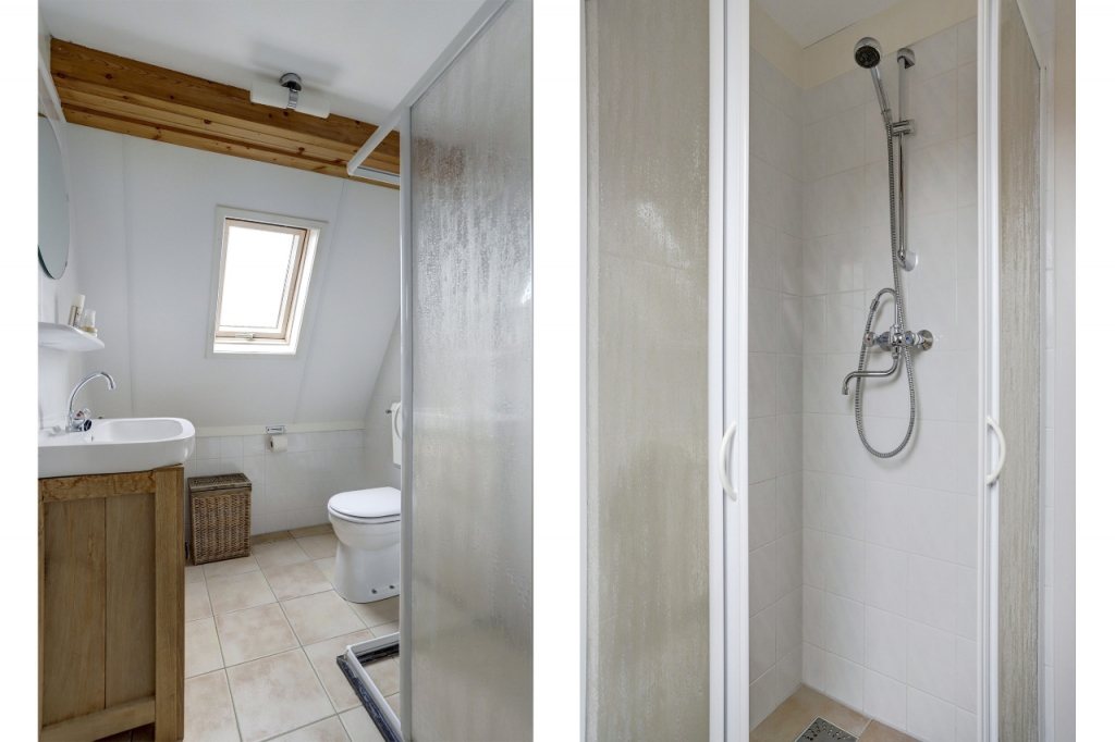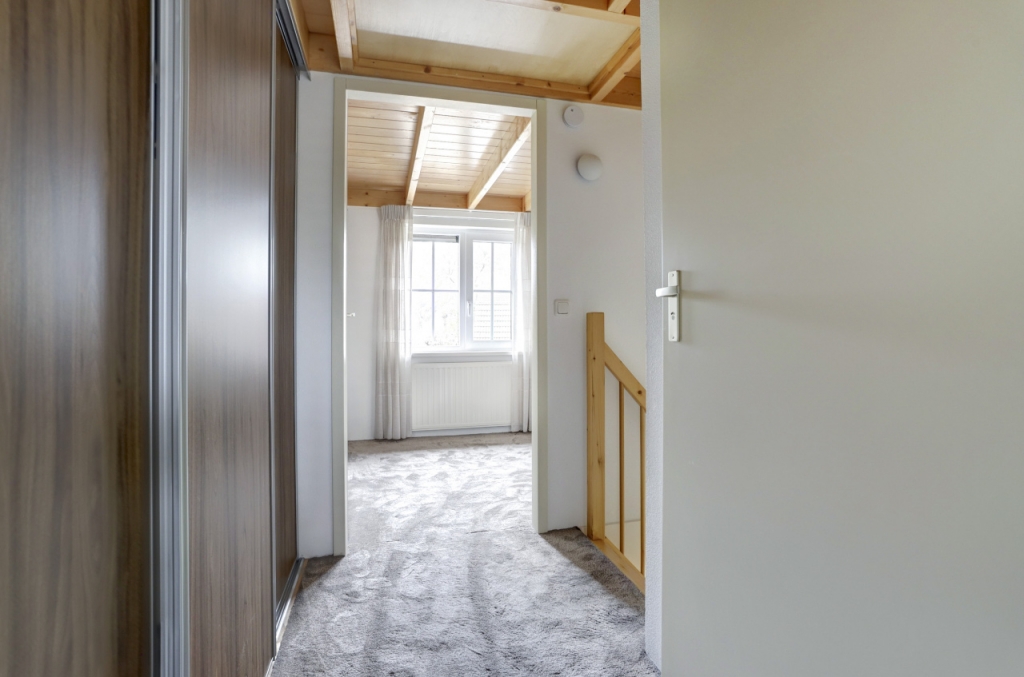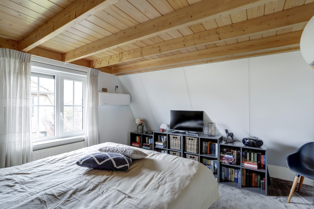 1e verdieping: overloop met schuifdeurkastenwand en luik naar bergzolder; 2 slaapkamers met balken plafond, waarvan 1 met vaste kastenwand en airco; badkamer met dakraam, douchecabine, wastafelmeubel en 2e toilet.