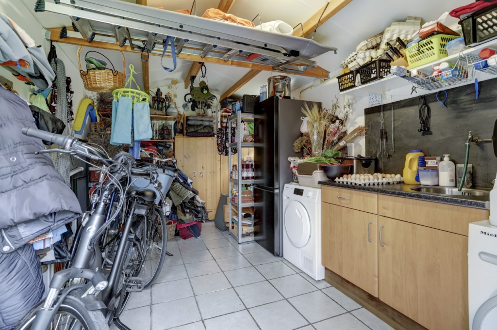 . De berging, groot ca. 13 m², is voorzien van een tegelvloer, een keukenblok en een wasmachine-aansluiting.