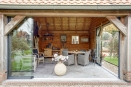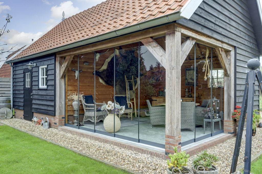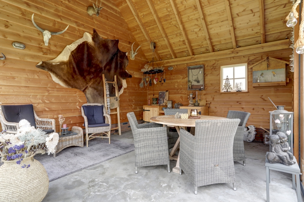 Het sfeervolle object is deels in gebruik als tuinkamer, deels als berging en deels als gastenverblijf.