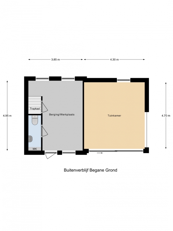 tuinkamer (ca. 20 m²), berging/hobbyruimte; toiletruimte met toilet, uitstortgootsteen en electragroepen; trapopgang met kleine berging.