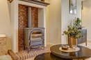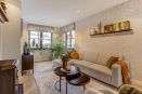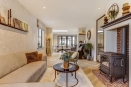 Een lichte L-vormige woonkamer met schouw, PVC-vloer, airconditioning en