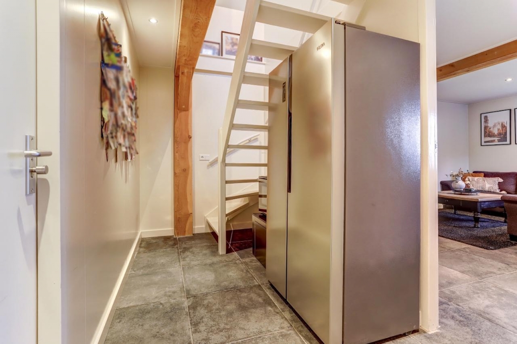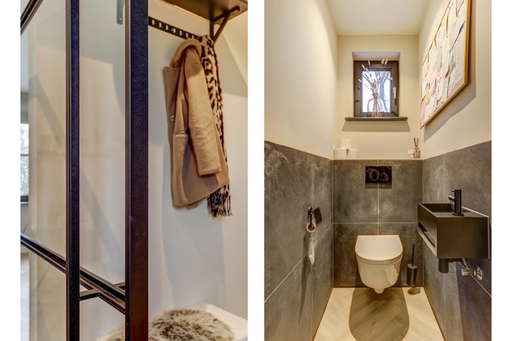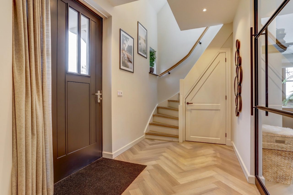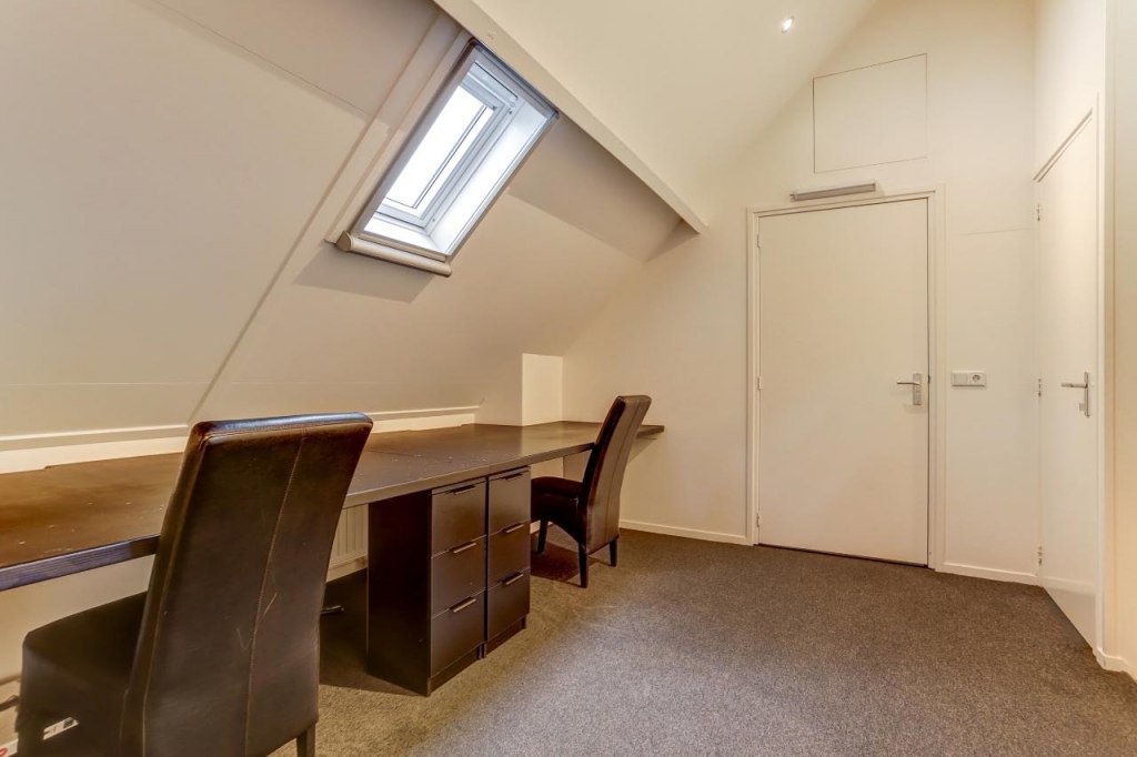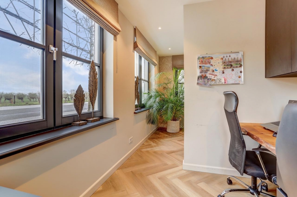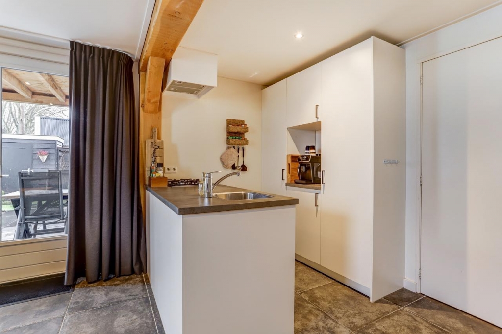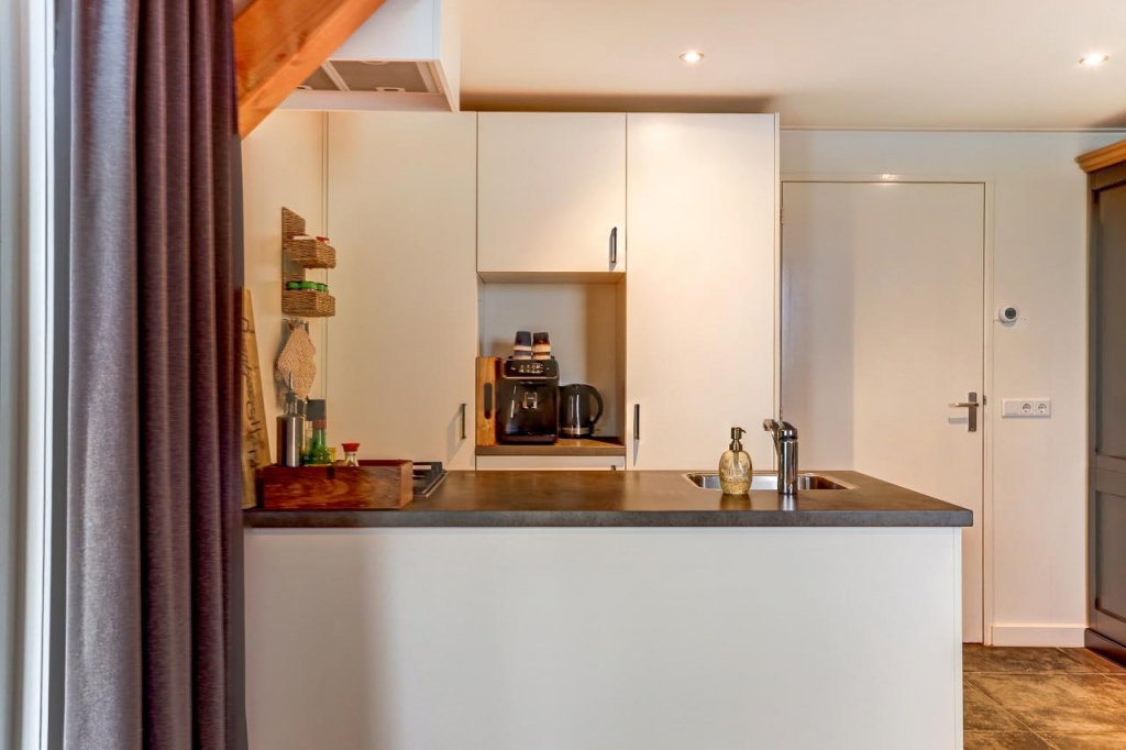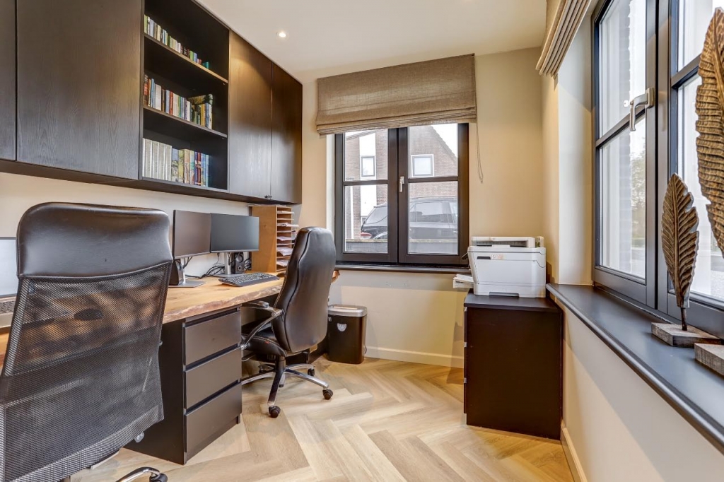 Via een hal bereikt u de tweede trapopgang, een extra moderne toiletruimte en een tweede woon/werkkamer met openslaande deuren en een open keuken met een sfeervol water- en kookeiland. Deze extra leefruimte maakt de woning bijzonder multifunctioneel.