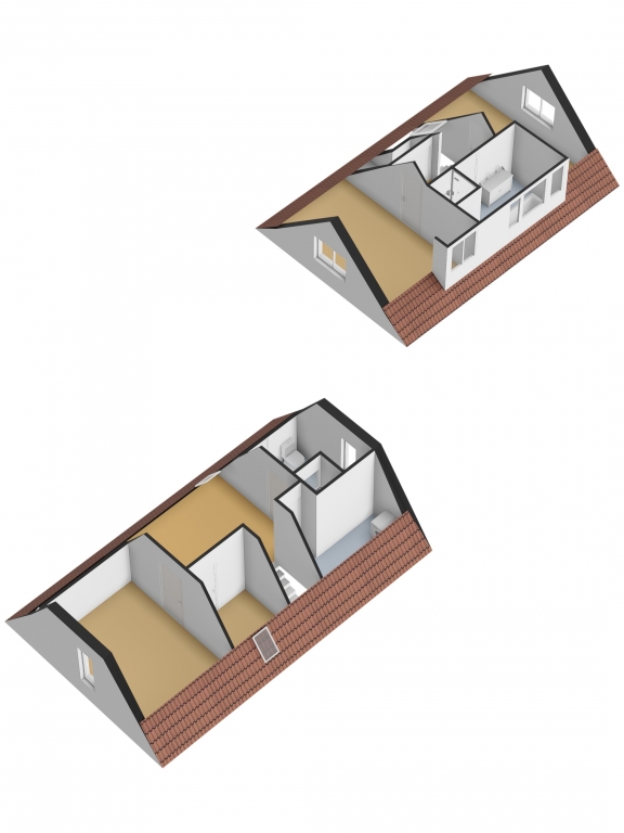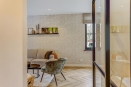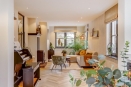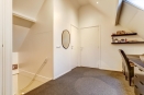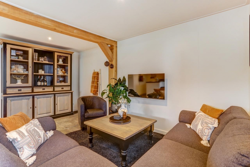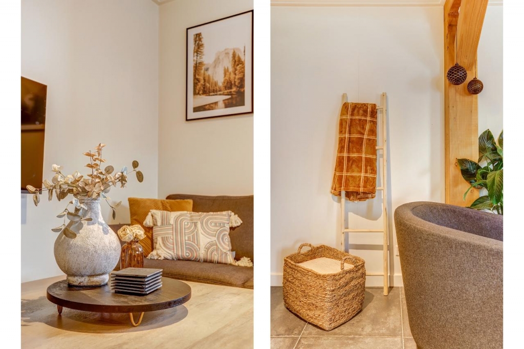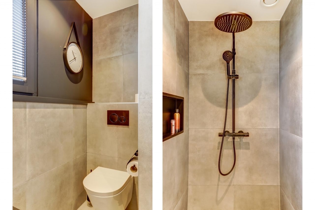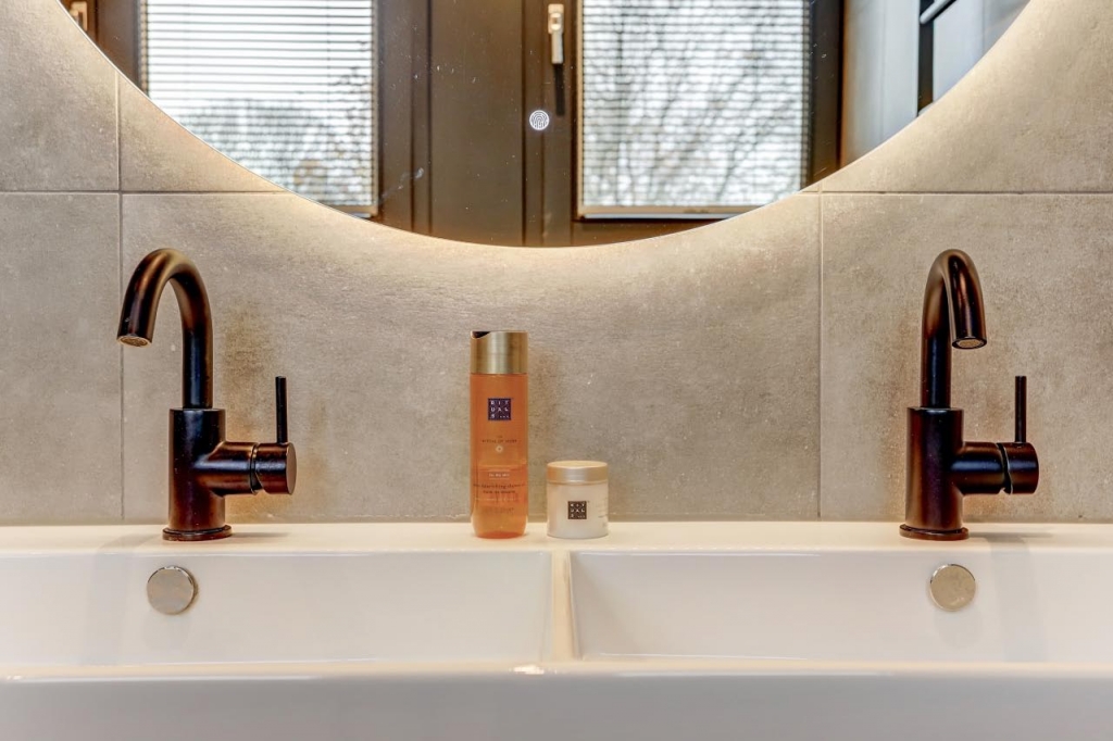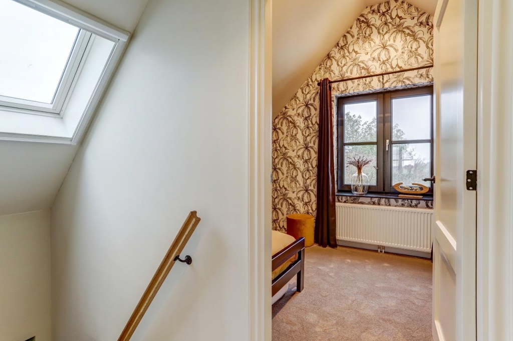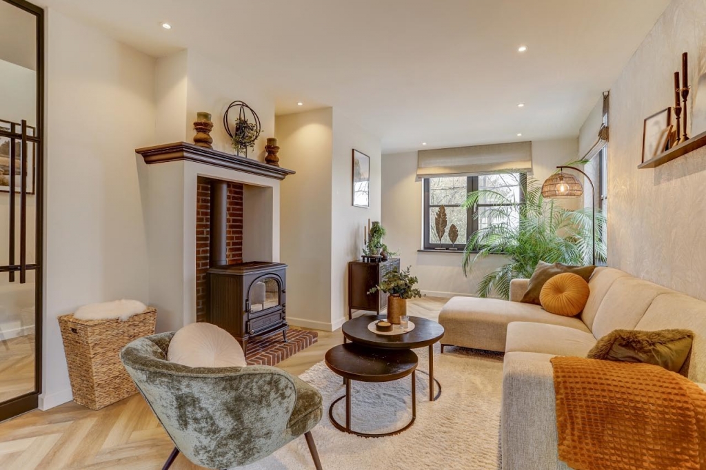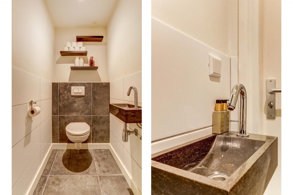 Via een hal bereikt u de tweede trapopgang, een extra moderne toiletruimte en een tweede woon/werkkamer met openslaande deuren en een open keuken met een sfeervol water- en kookeiland. Deze extra leefruimte maakt de woning bijzonder multifunctioneel.