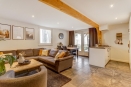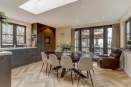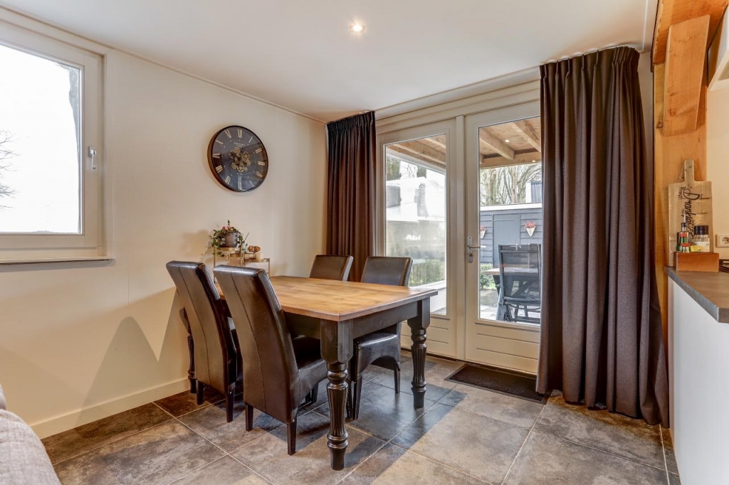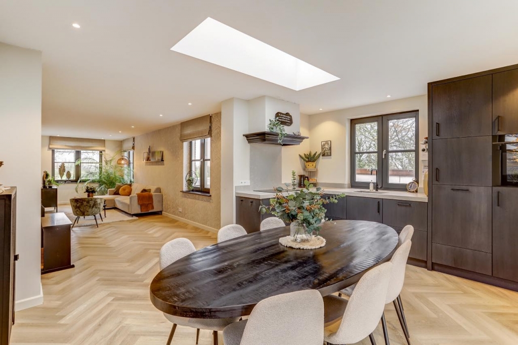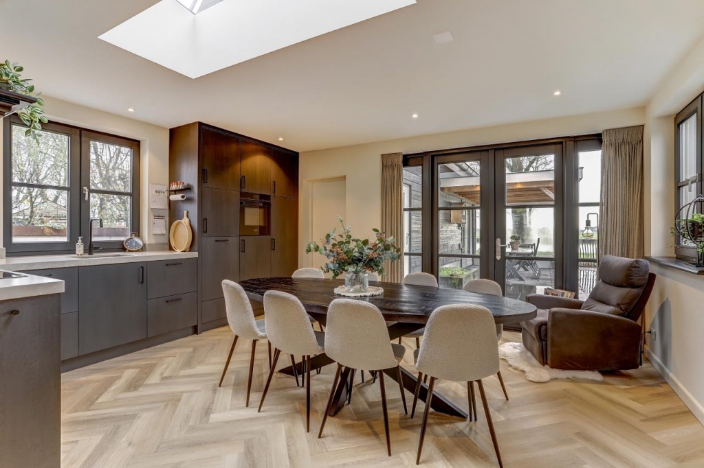 Aangrenzend bevindt zich de woonkeuken, voorzien van lichtkoepel, tuindeuren