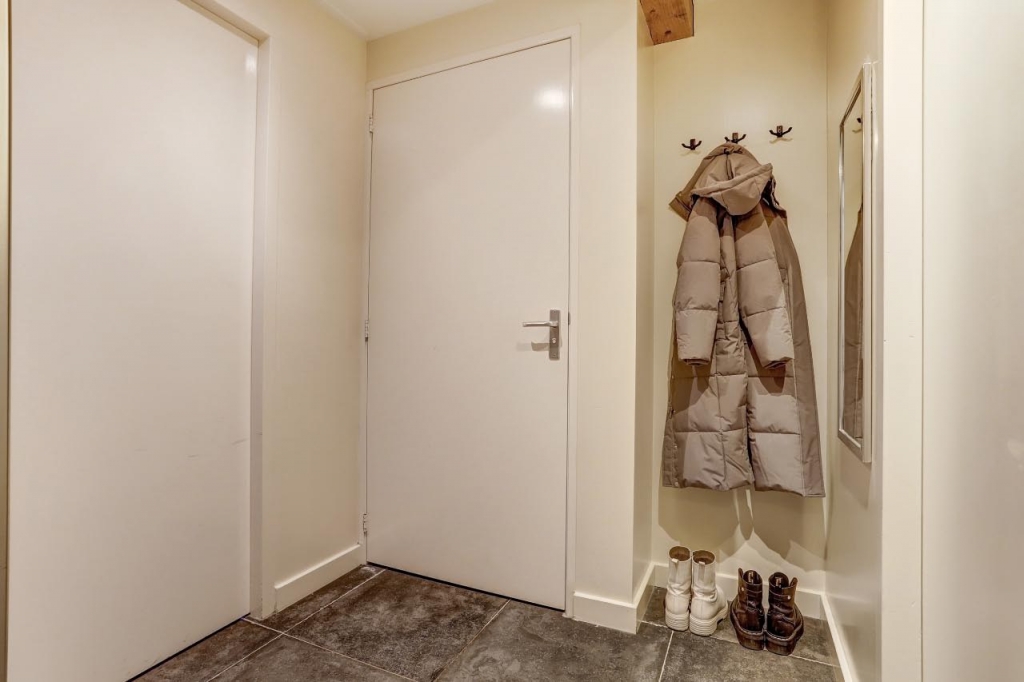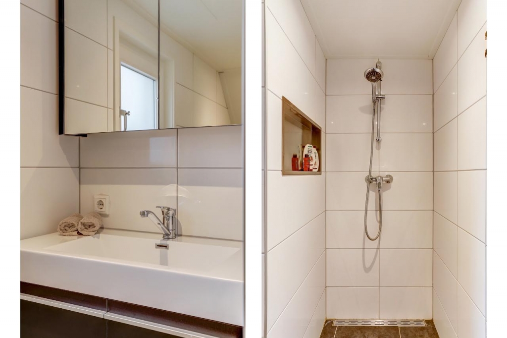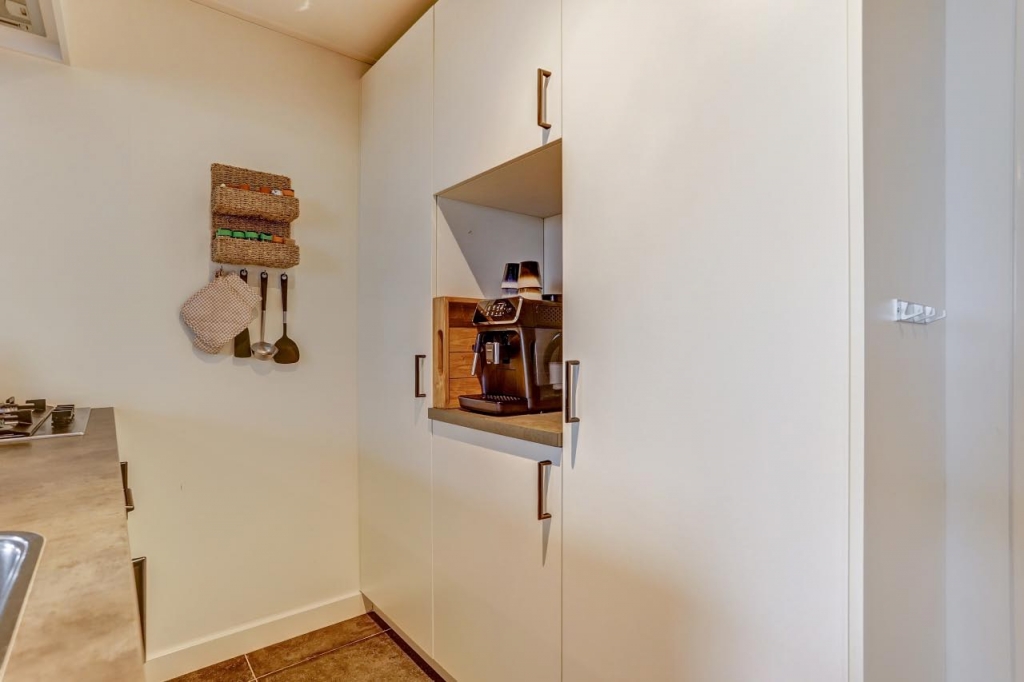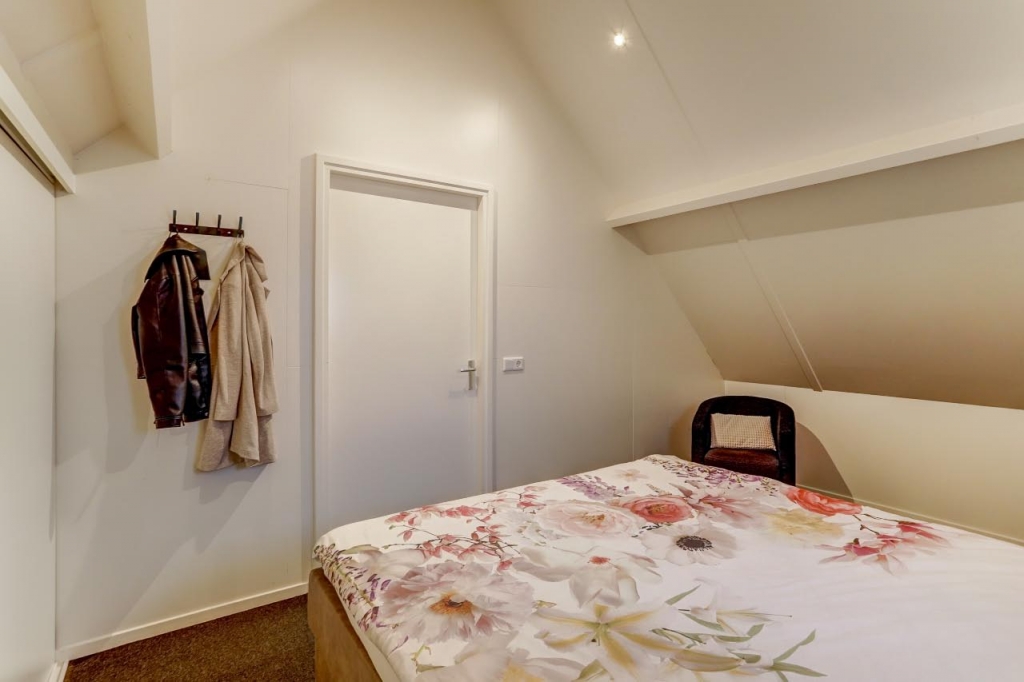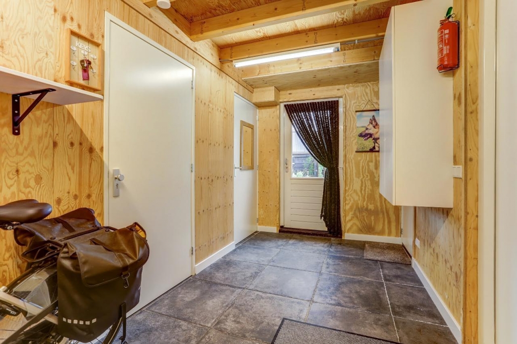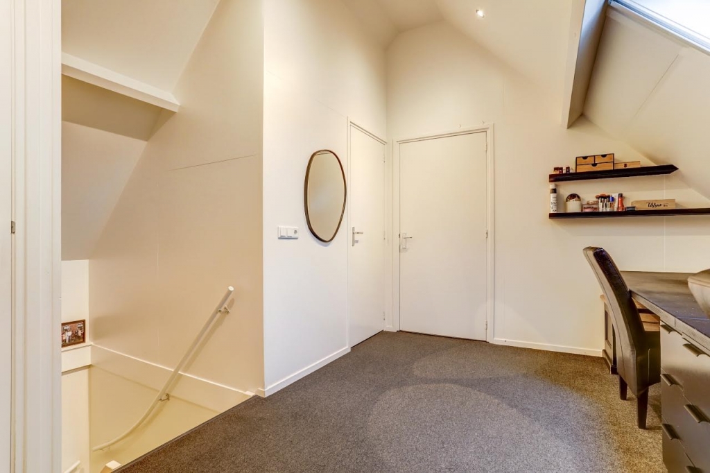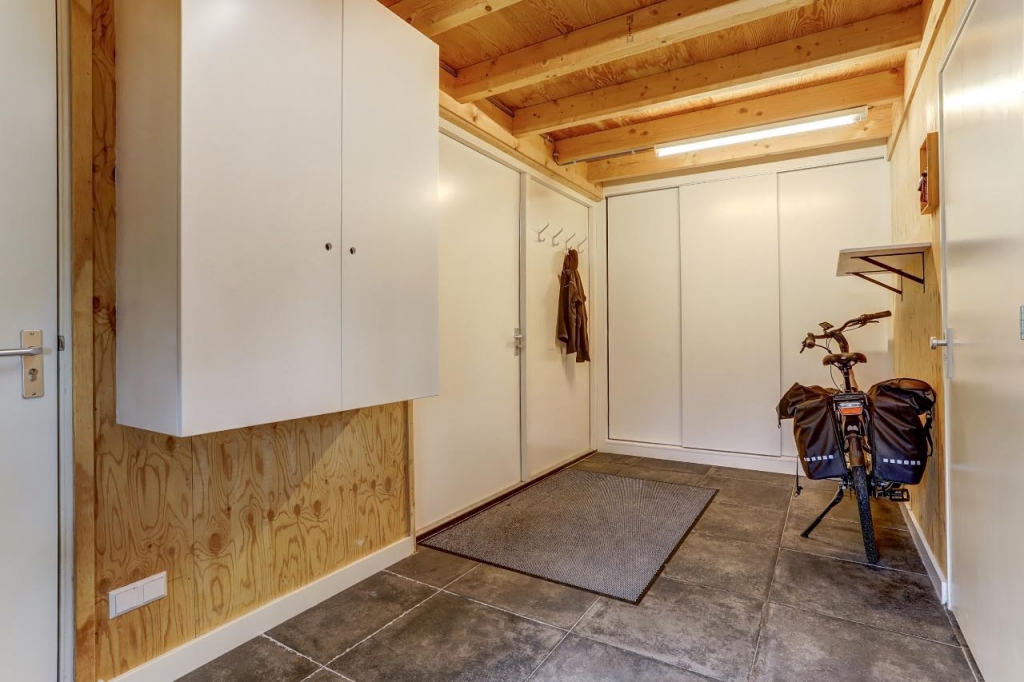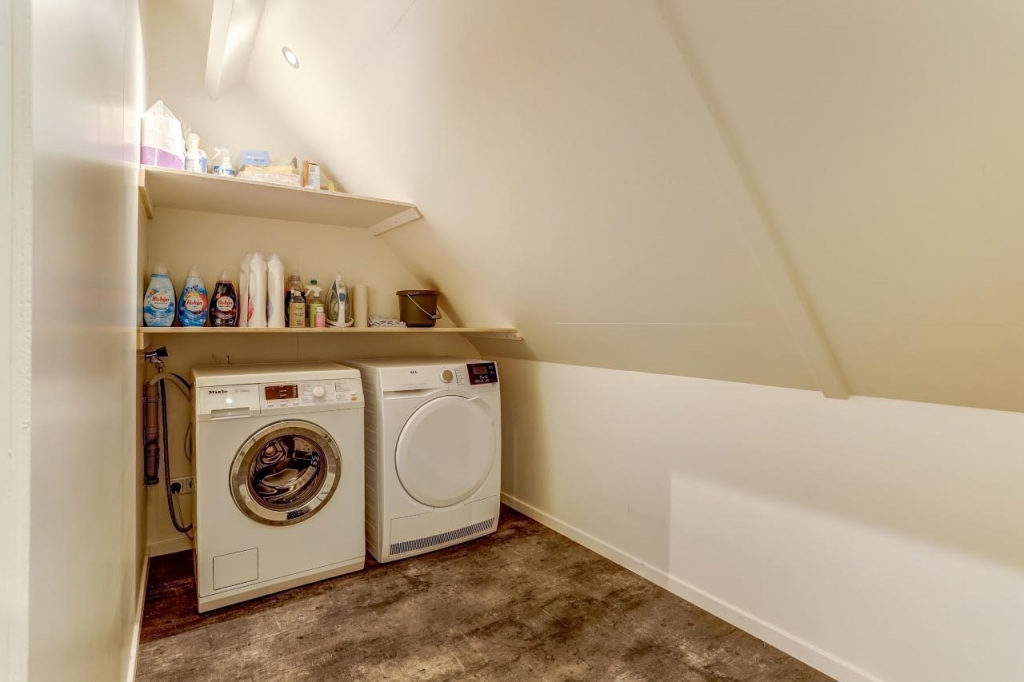 De keuken geeft toegang tot de voormalige garage, die volledig bij de woning is getrokken en daarmee ideaal is als woon/werkruimte, praktijkruimte of hobbyruimte. Inpandige berging/bijkeuken met tweede meterkast en een praktische schuifdeurenkastenwand.