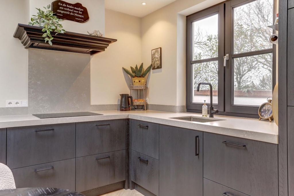 naar het terras en een luxe keuken in hoekopstelling met composiet werkblad,