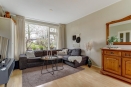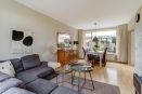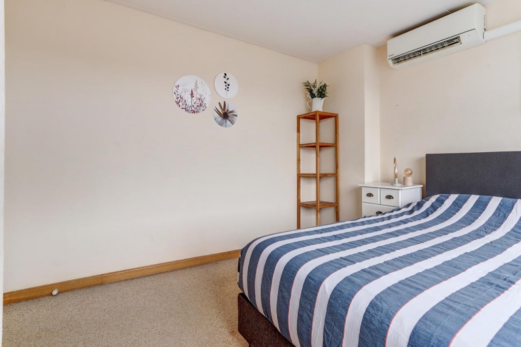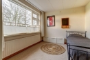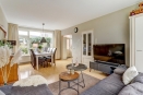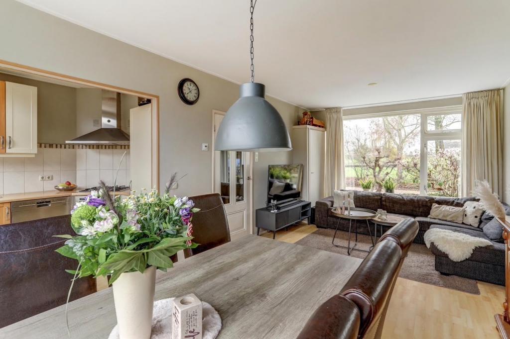 De doorzon woonkamer biedt veel licht en een prettig uitzicht op zowel de voor- als achtertuin én het grasveld. Een inbouwkast zorgt voor extra bergruimte.