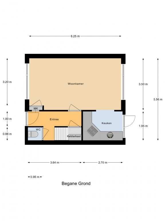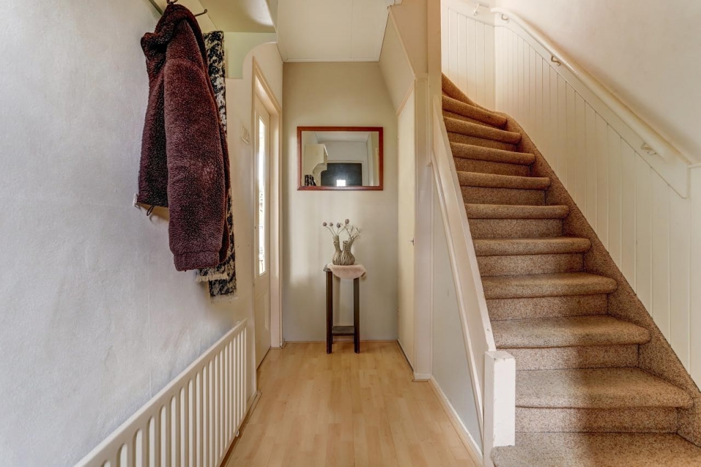 Bij binnenkomst stap je in de entreehal met meterkast, trapopgang en toegang tot de praktische kelderruimte (ca. 2,60 × 0,75 m).