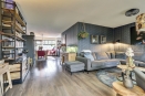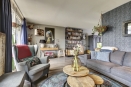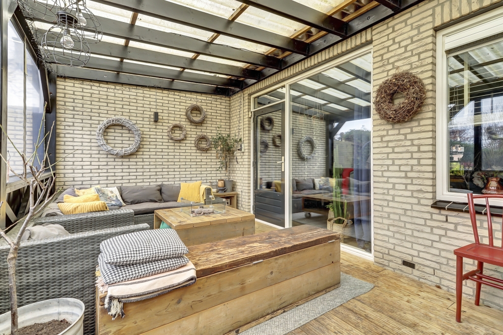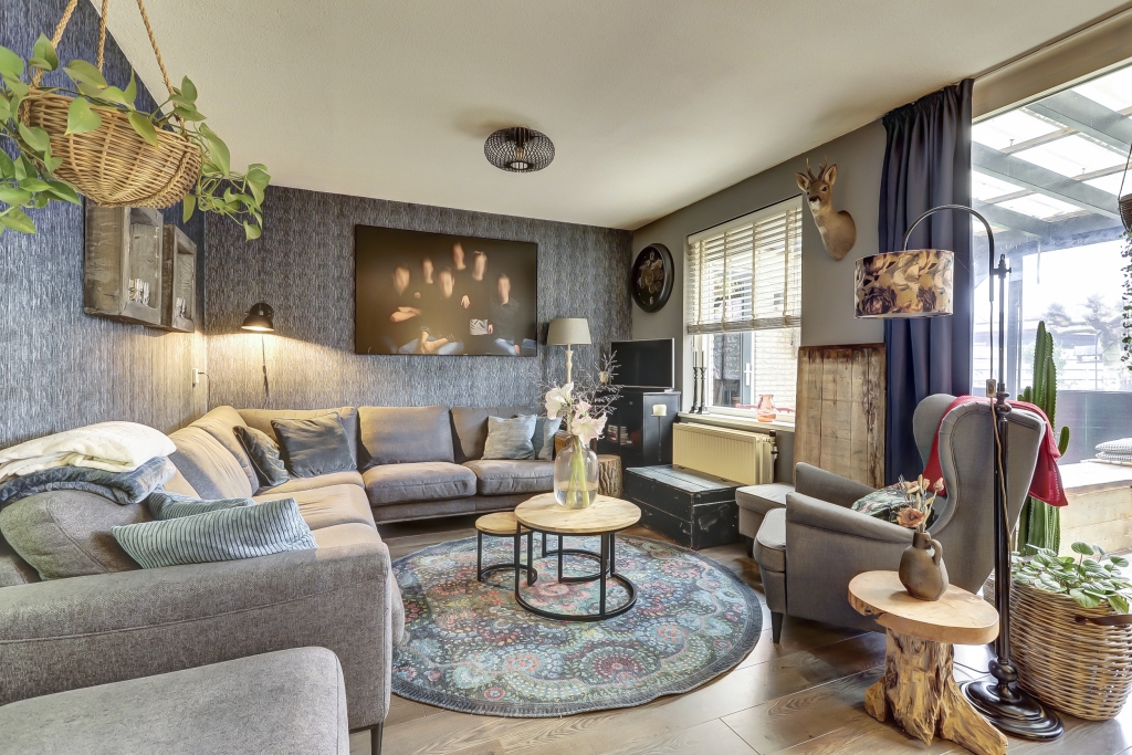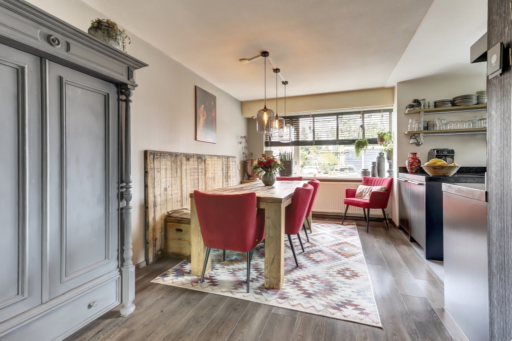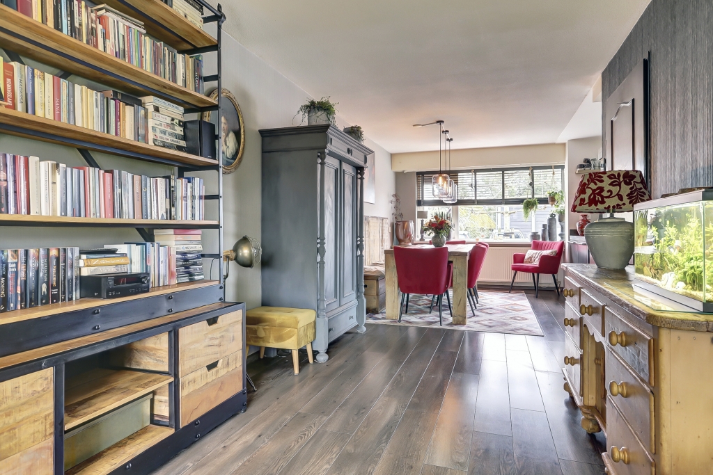 De sfeervolle L-vormige woonkamer beschikt over een fraaie erker aan de voorzijde. Aan de achterzijde geeft een openslaande deur toegang tot het aangebouwde prieel en de tuin, waardoor binnen en buiten naadloos in elkaar overlopen.
