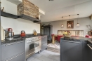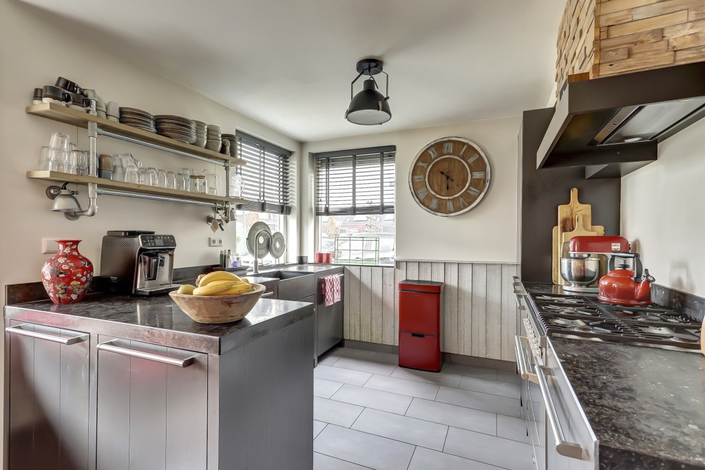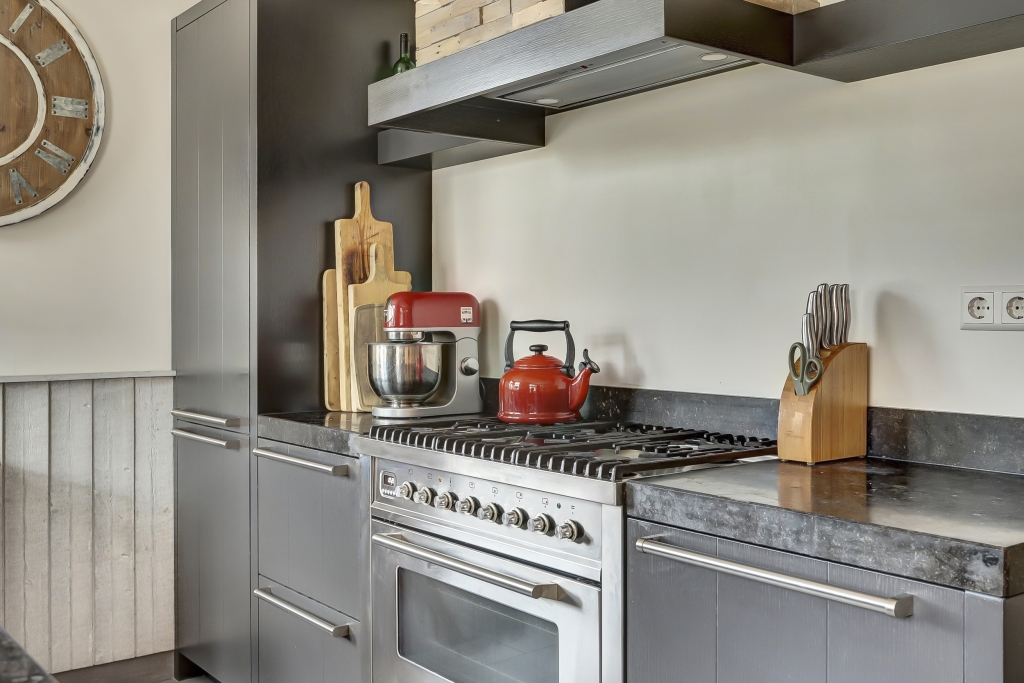 De ruime halfopen keuken is uitgevoerd met luxe werkbladen van Belgisch hardsteen en voorzien van alle gemakken, waaronder: Boretti gasfornuis met 6-pits gaskookplaat en oven, afzuigkap, koelkast, vaatwasser en een close-in boiler.