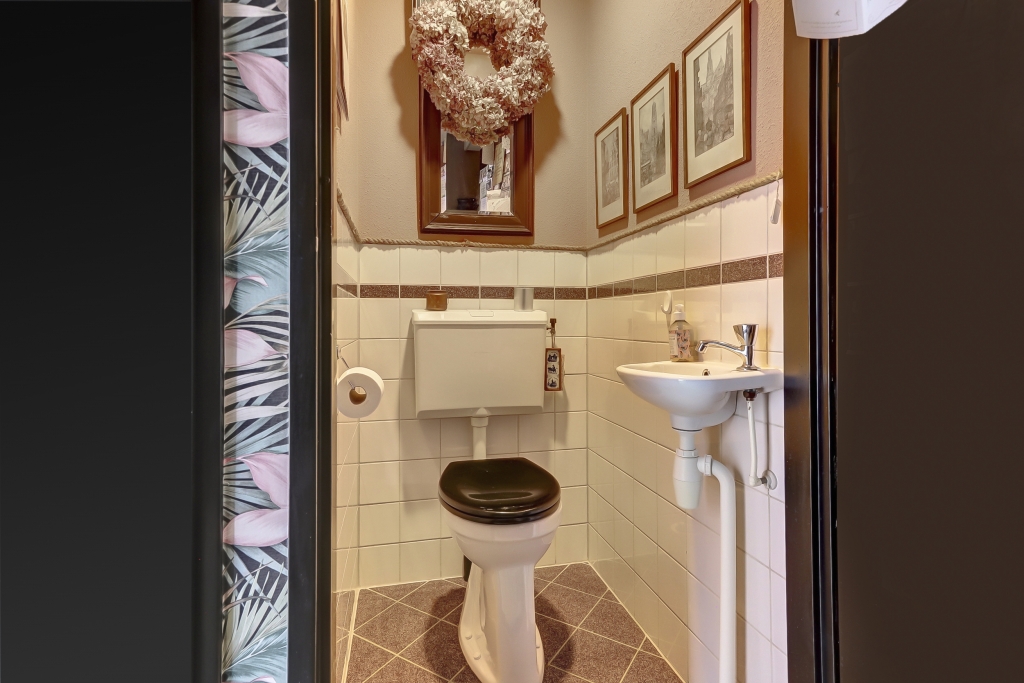 Via de verzorgde entree komt u in de hal met meterkast, trapopgang, trapkast en een toiletruimte met toilet en fonteintje.