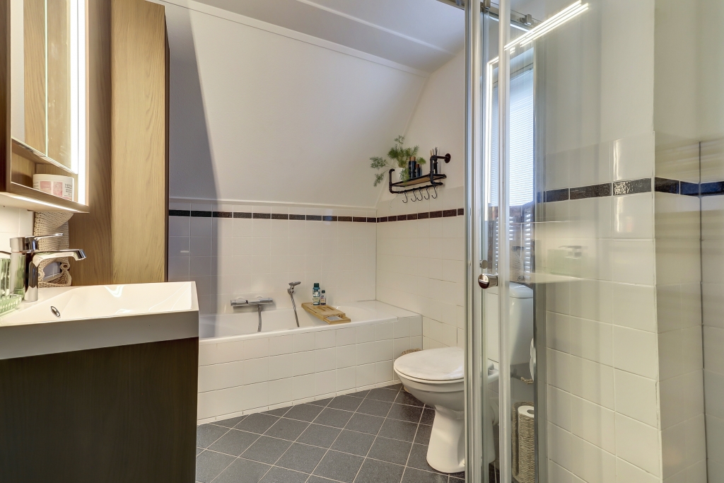 De royale badkamer is compleet uitgerust met: ligbad, douchecabine, wastafelmeubel met hoge kast (vernieuwd in 2025), tweede toilet en handdoekradiator