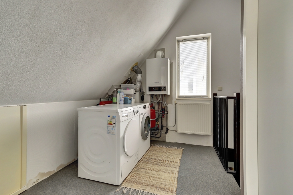Via een vaste trap bereikt u de tweede verdieping. Op de voorzolder bevinden zich: de opstelling van de cv-ketel (Nefit Trendline, ca. 2020), aansluiting voor wasmachine en extra bergruimte en een kleine vliering