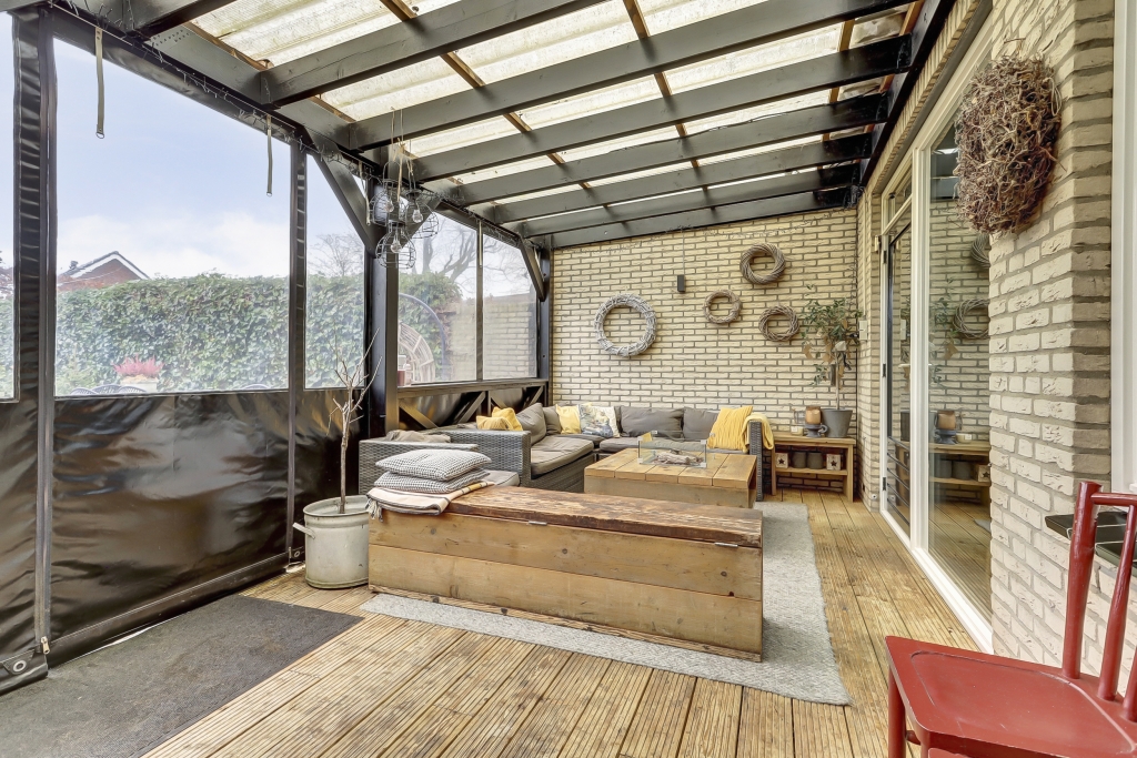 Het aangebouwde prieel vormt een echte meerwaarde: direct verbonden met de woonkamer en uitgevoerd met hardhouten vloerdelen, verlichting en een oprolbaar zonne-/winddoek. Een perfecte plek om tot in de late uurtjes buiten te zitten.