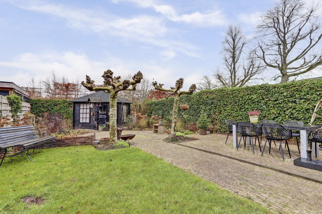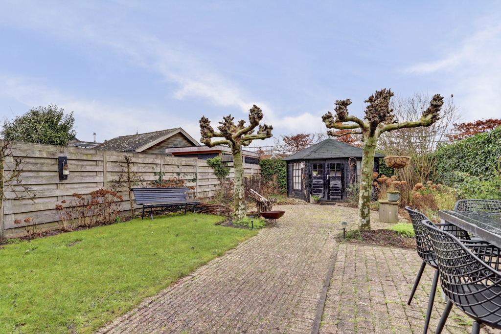 Achter in de tuin staat een sfeervolle vrijstaande houten berging van circa 7 m² met openslaande deuren, ideaal voor opslag.